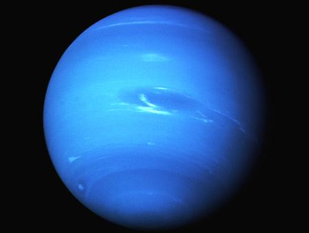 Sua atmosfera é composta principalmente de metano, o que dá ao planeta sua cor azul. Netuno tem um diâmetro aproximadamente quatro vezes maior que o da Terra, treze luas em sua órbita, e um fraco sistema de anéis.